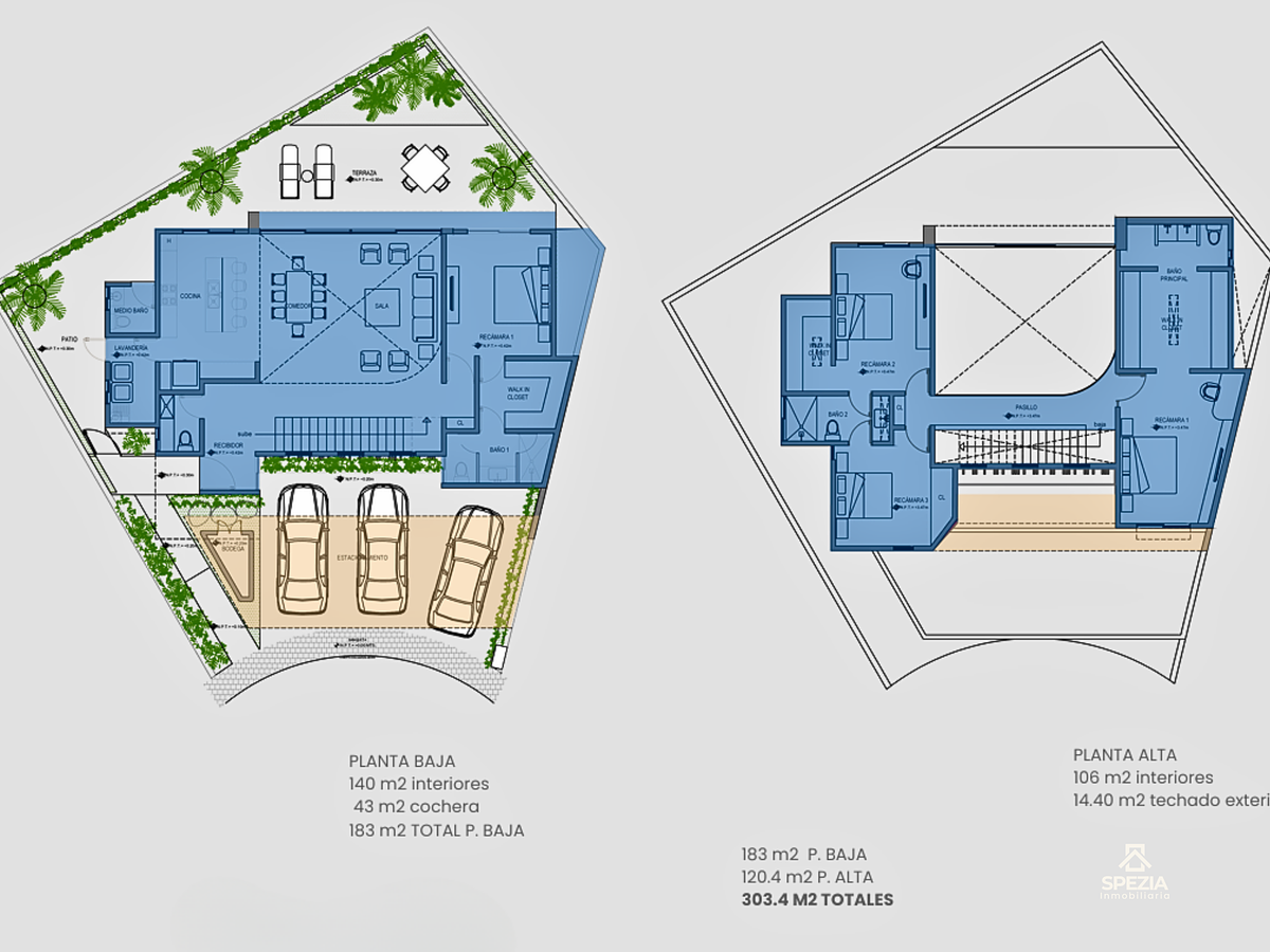 Planta Baja: Sala y comedor con doble altura, cocina integral equipada y recámara secundaria con walk-in closet y baño completo.